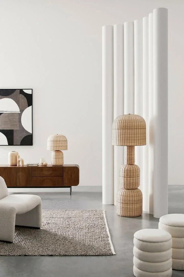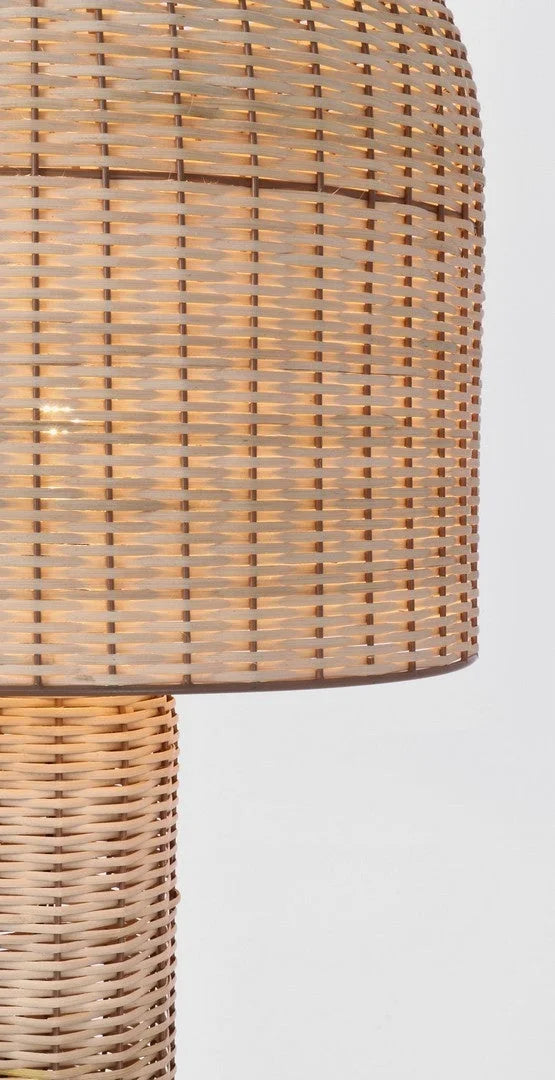 BIZZOTTO golvlampa SIKKIM beige. En harmonisk kombination av naturlig rotting och solid metallkonstruktion, som tillför värme och elegans till rummet. Den unika designen inspirerad av organiska former gör att den passar perfekt i både moderna och boho-inredningar. Den perforerade lampskärmen sprider subtilt ljuset, vilket skapar en mysig atmosfär i vardagsrummet, sovrummet eller relaxutrymmet. Den långa 3,5 meter långa sladden möjliggör en flexibel placering av lampan på valfri plats. Sikkim är en stilren belysning som kombinerar funktionalitet med den unika karaktären hos naturliga material. Lampa: E27 max. 40 W (ingår ej) Mått: höjd 157 cm / bredd 50 cm Bruttovikt: 12,1 kg.