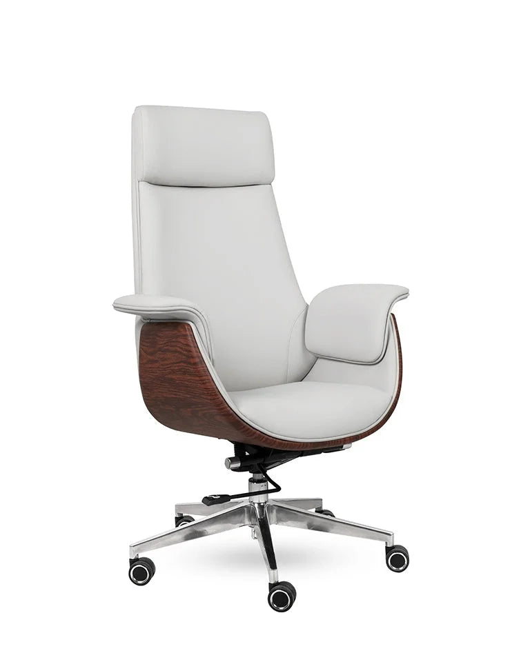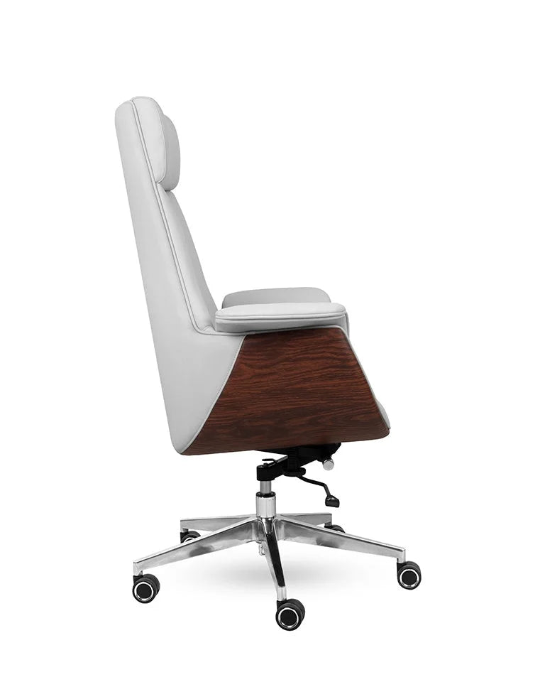 En elegant lösning för dig som värdesätter komfort och stil på arbetsplatsen. Klädseln är tillverkad av högkvalitativt konstläder i en ljusgrå nyans som vackert kontrasterar mot de varma detaljerna i träinspirerat konstläder. Det formade ryggstödet med nackstöd samt mjuka armstöd ger ergonomiskt stöd under långa arbetsdagar.