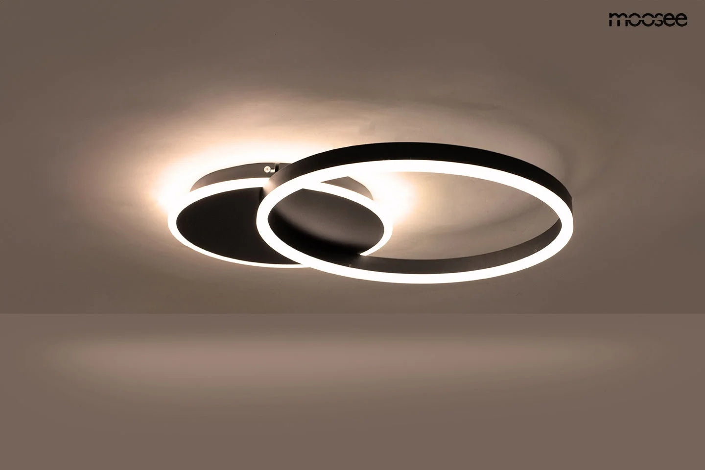 En elegant och stilrent minimalistisk plafond som passar perfekt i moderna och industriella miljöer. Designen utmärks av två korsande ringar med inbyggd LED-belysning, vilket skapar ett effektfullt men harmoniskt uttryck i rummet.